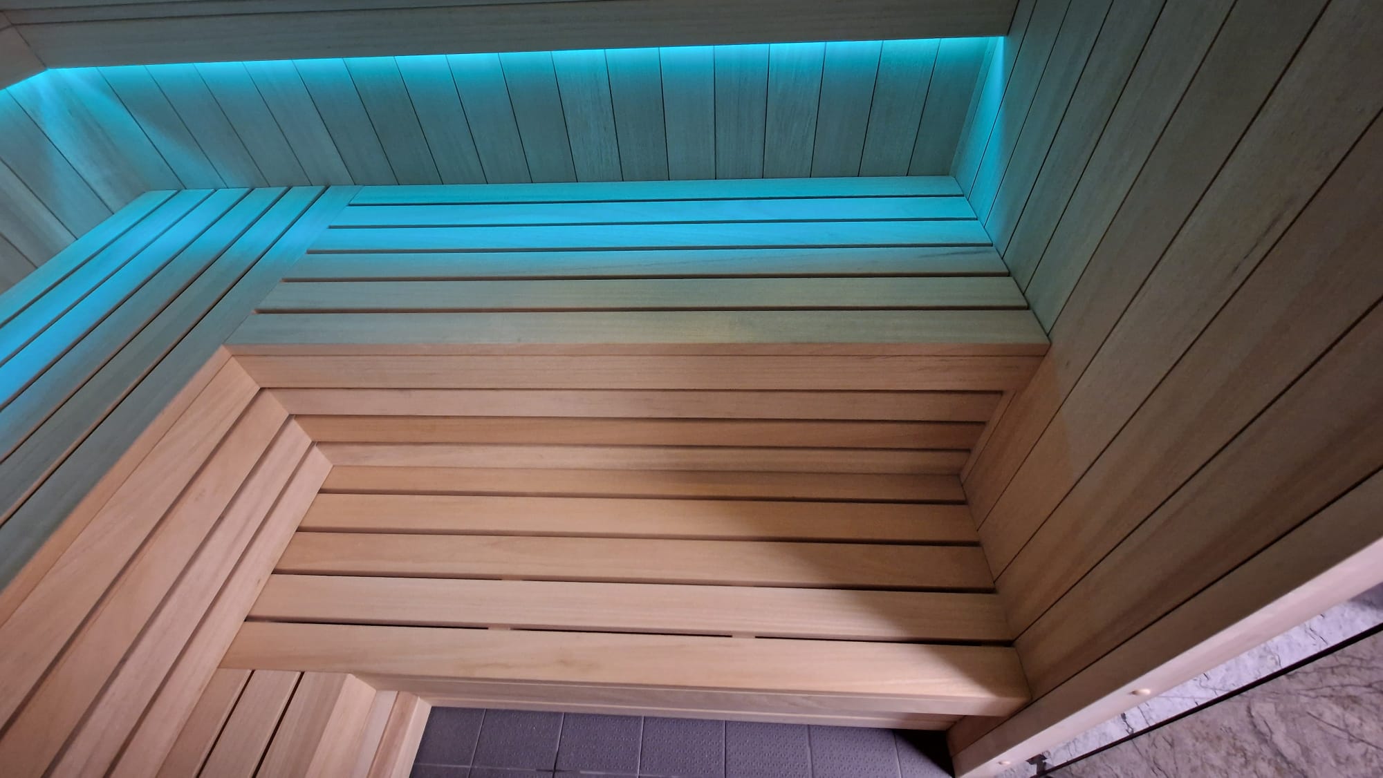Obicie ścian i sufitu boazerią Abachi Afrykańskie klasy Premium, profil STS 119x15mm w pionowym układzie na ścianach. Wykonanie Konstrukcji ław saunowych w 3 poziomach, oraz obudowanie ich też z nienagrzewającego się drewna Abachi 90x22mm wraz z oparciami podkolanowymi oraz na ścianie najwyższego poziomu. Montaż drzwi z hartowanego szkła, transparantnego wraz z listwowaniem 800x2000mm.